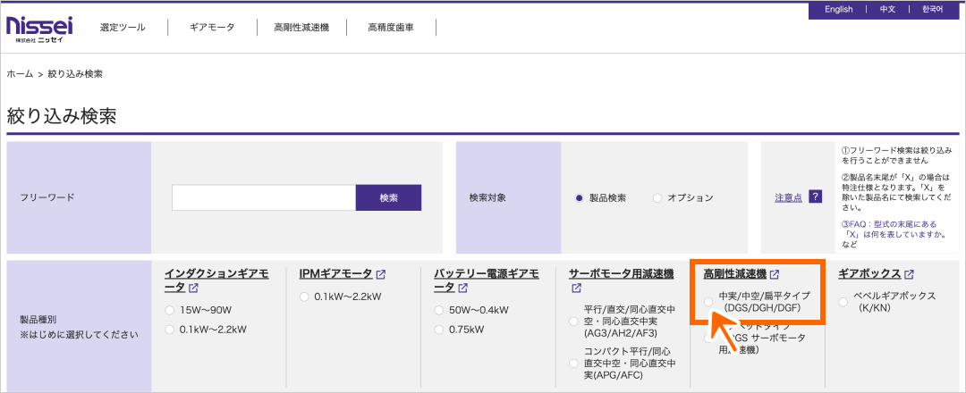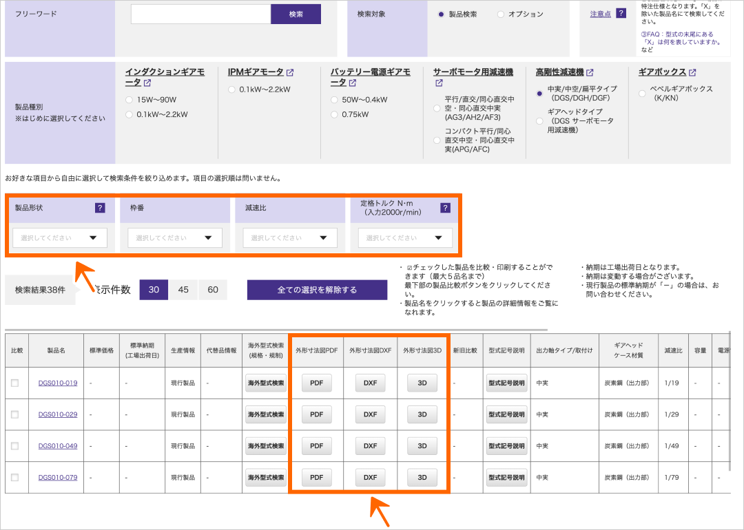 各種ダウンロード 各種データをダウンロードいただけます。 高剛性減速機のカタログなどの各種データを以下からダウンロードいただけます。 なお、お客様情報の入力が必要となりますのでご了承ください。 性能表 ▼ 寸法図 ▼ CADデータ ▼ カタログ ▼ 取扱説明書 ▼ 性能表 寸法図 CADデータ 高剛性減速機のCADデータは、選定ツールからダウンロードいただけます。 CADデータダウンロード手順 絞り込み検索の画面から、中実/中空/扁平タイプ(DGS/DGH/DGF)を選択してください。 中段の絞り込み条件を選択いただき、下段に表示された型式のCADデータをダウンロードすることができます。 PDFカタログ 表紙をクリックすると、ダウンロード用ページへ移動します。 なお、お客様情報の入力が必要となりますのでご了承ください。 PDF取扱説明書 表紙をクリックすると、ダウンロード用ページへ移動します。 なお、お客様情報の入力が必要となりますのでご了承ください。