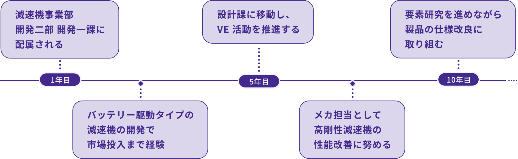 その後機械設計担当として高剛性減速機の性能改善にも寄与した後、現在は要素研究を進めながらサーボモータ向け高精度減速機の仕様改良に取り組む。