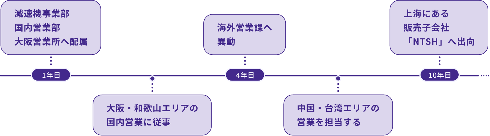 国内営業を3年ほど経験したのち、海外営業課へ異動。中国・台湾・韓国エリアを担当しながら実績を積み上げ、2025年からは上海にある販売子会社「NTSH」への長期出向を果たす。