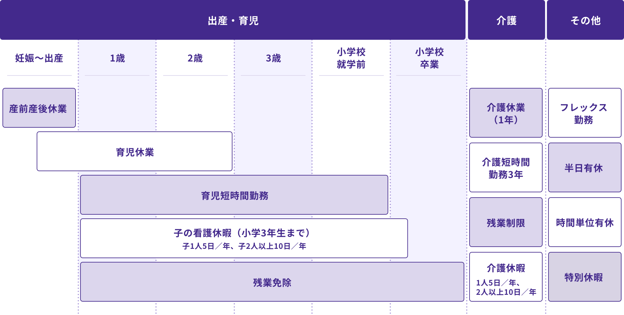 ライフステージが変化しても安心して働き続けられるよう、子育てや介護を支援する制度を充実させています。